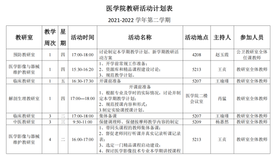 计划的效果关键靠落实,在学院领导的支持下,BEAT365英国官网教务办将持续跟进以上计划的实施,一方面积极配合各教研室做好教学服务工作,为各项活动的开展提供支持,一方面严格监督各教研室按照计划要求认真开展活动,把活动开展情况作为基层教学组织和任课教师评优评先的重要依据。相信我院通过这一系列计划的有效实施,能够有效促进教学秩序的规范,有效促进教学质量的提高,有效促进高质量实用型卫生人才的培养,助力BEAT365英国官网高质量、可持续发展。