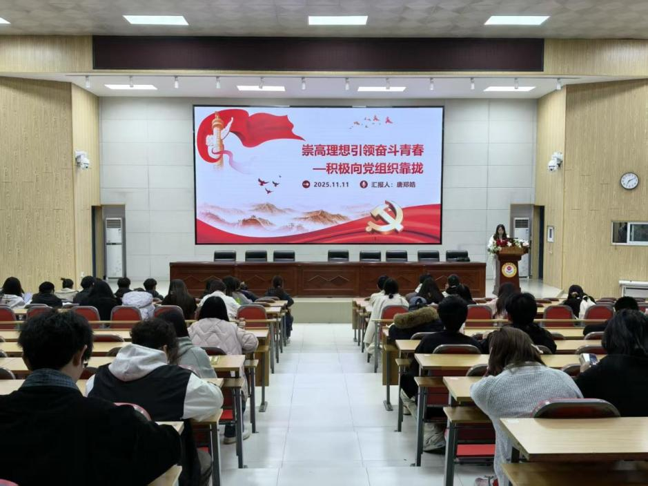 为深化学生干部思想政治素养,引导树立正确入党动机、激发向党组织靠拢的动力,唐郑皓老师以《崇高理想引领奋斗青春——积极向党组织靠拢》为主题授课。课堂上,唐老师阐释党旗的精神内核与时代价值,解析入党资格条件、流程及核心要求,让学生干部加深对党的性质、宗旨与使命的认知,坚定追随党的步伐、向党组织靠拢的信念。