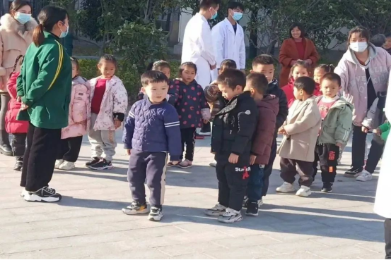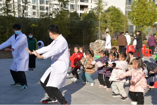 活动还吸引来了一群正在游园的幼儿园小朋友,在志愿者的组织下,他们一招一式认真地学习。