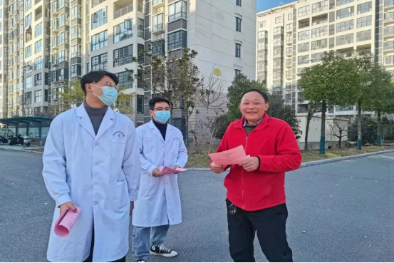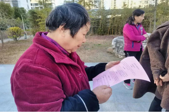 红旗行动小组成员向社区居民分发宣传单,普及冬季健康知识。