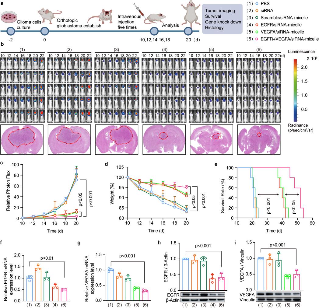 针对这一世界性医学难题,研究团队受球形核酸纳米药物启发,创新性构建了一种新型非阳离子二十二碳六烯酸(DHA)基 siRNA 胶束递送系统。该系统通过点击化学反应与亲疏水自组装制备而成,核心材料均获得美国 FDA 批准,从源头保障了制剂的生物安全性;同时可通过清道夫受体 A(SR-A)介导实现肿瘤精准递送,有效突破血脑屏障壁垒,完成脑部病灶的靶向富集与细胞摄取