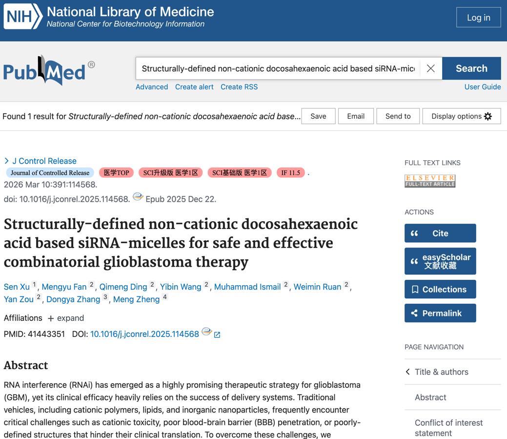 近日,BEAT365官网BEAT365英国官网青年教师徐森(学校“高层次人才引进计划”引进人才,“青年英才培育计划”培养对象)依托BEAT365英国官网与河南大学访学项目,联合河南大学科研团队在恶性脑肿瘤基因治疗与纳米药物递送领域取得重大突破性进展。相关研究成果以《Structurally-defined non-cationic docosahexaenoic acid based siRNA-micelles for safe and effective combinatorial glioblastoma therapy》为题,正式发表于国际医学领域顶级学术期刊《Journal of Controlled Release》,为胶质母细胞瘤的临床治疗研究提供了全新方案,也充分彰显了BEAT365官网人才强校战略的落地成效与医药学科领域的强劲科研创新实力。
