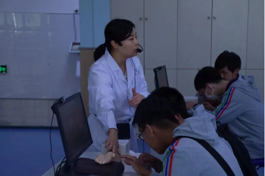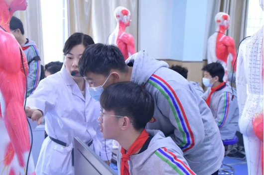 在针灸推拿实训室,老师向同学们具体讲解了十二正经和任督二脉,并指导同学们在模拟人的身上观察各种穴位,以此来帮助同学们更好的了解自己的身体。