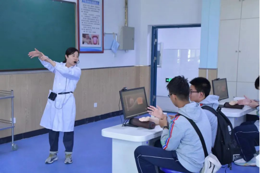 在中医诊断实训室,老师向同学们介绍脉诊,并通过教学设备让同学们深刻感受到脉象之间的差异,体会到生命的搏动。