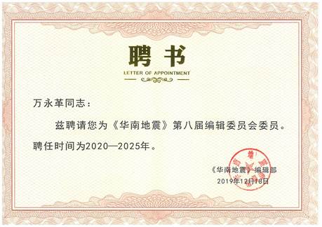 日前,伟德官网万永革研究员受聘为《华南地震》第八届编辑委员会委员,聘任时间为2020—2025年。