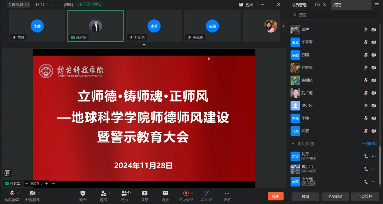 为进一步加强师德师风建设,提升教师队伍整体素质,伟德官网于2024年11月29日通过钉钉线上会议的形式举办了以“立师德 铸师魂 正师风”为主题的师德师风建设暨警示教育大会。会议由学院副院长孙珍军主持,全体教职工参加了此次会议。