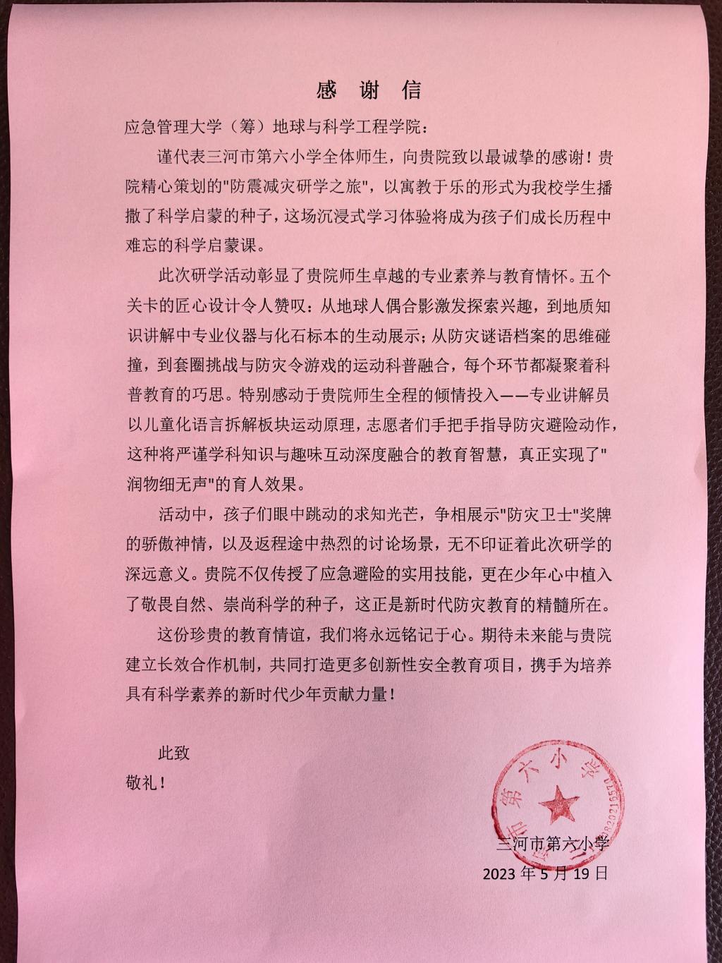 近日,伟德国际victor1949收到来自三河市第六小学全体师生的感谢信,信中高度评价了学院5月15日策划的“防震减灾研学之旅”活动,并对伟德官网师生在活动中表现出的专业素养与教育情怀表达了诚挚谢意。
