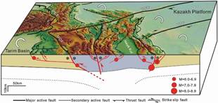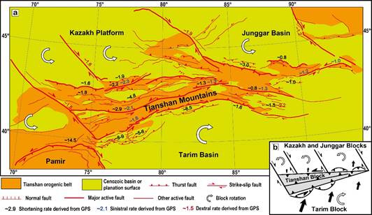 天山地区GPS速度场及构造变形模式图